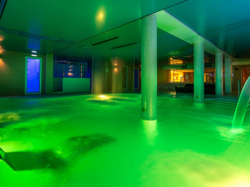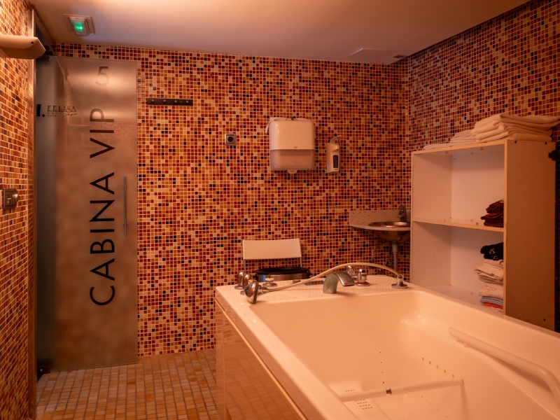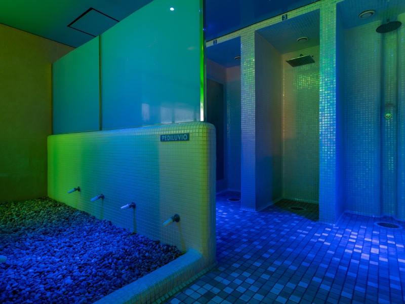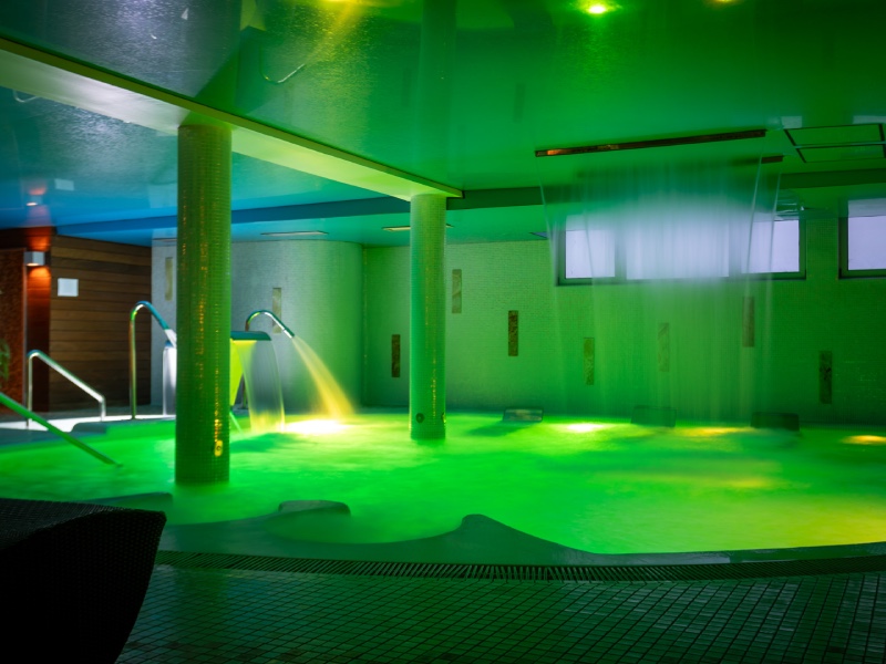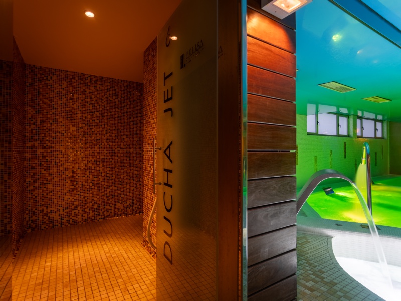 Dynamic pool with bubble beds, waterfall, curtains and cannons, underwater jets at different levels, cold zone, jacuzzi, Finnish sauna, Roman thermal baths, mist shower, bithermal and aroma shower, and relaxation chairs.